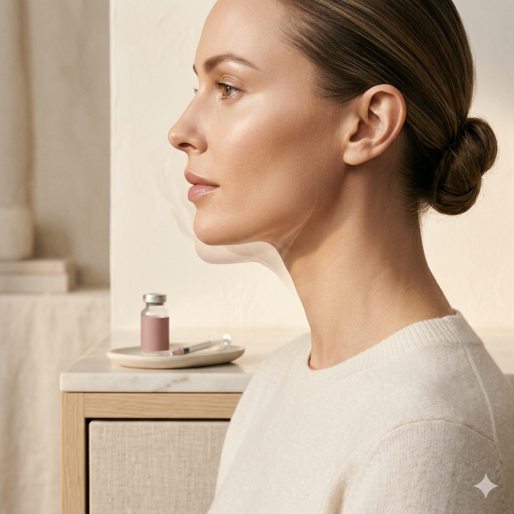 Belkyra är en FDA-godkänd injektionsbehandling med syntetisk deoxicholsyra som permanent förstör fettceller under hakan. Resultatet är en definierad käklinje utan kirurgi, narkos eller lång återhämtning.